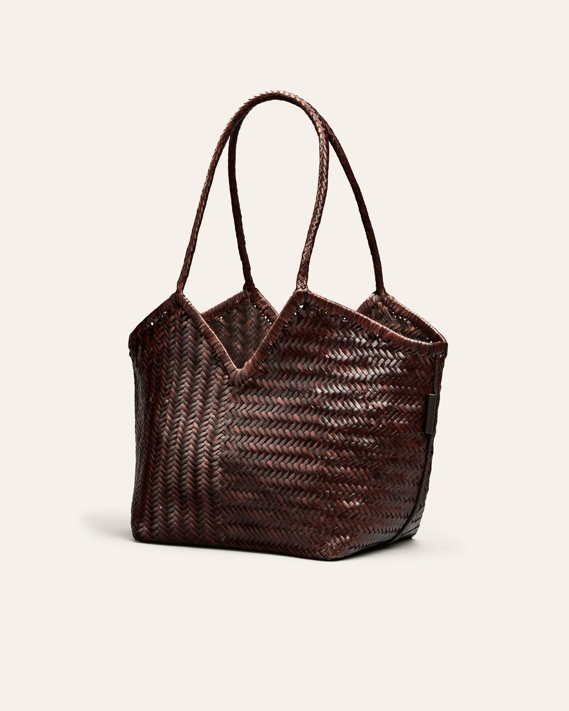 HUMI is a roomy leather tote made to be a practical choice for work, travel, or everyday errands. Handwoven from buffalo leather, it comes in two sizes and various color options. It features a v-shaped cutout on top, and slender handles for a comfortable fit on the shoulder.