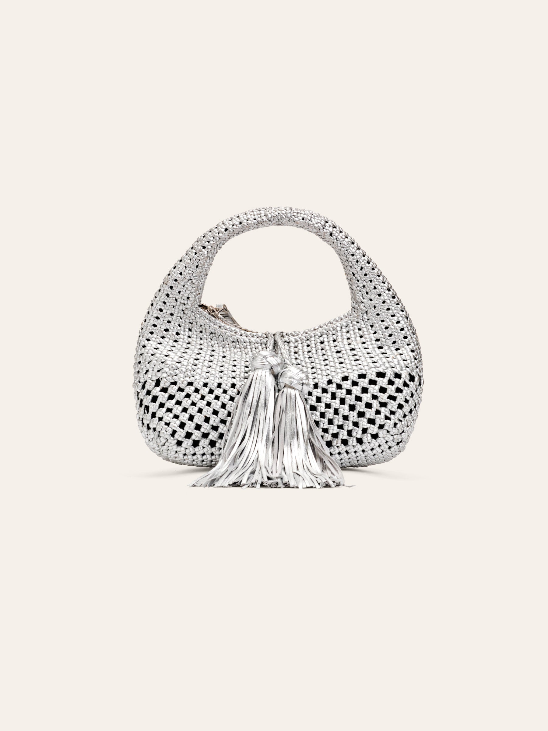 KEDI Mini Bag - hand-braided baguette bag in a captivating flower weave and topped with long, playful tassels. A cresent and fun silhouette to elevate any stroll around town, wedding or night out. Wear it with jeans, suit, summer dresses or cocktail attire. Yes, this little gem is that versatile. Sized to fit just the bare essentials in the nook of your arm.